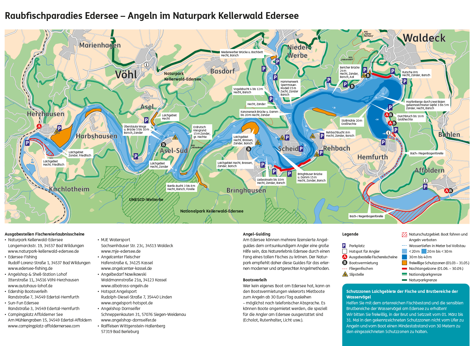 Der Edersee zählt mit rund 11,8 km² zu den größten Stauseen Deutschlands und bietet ideale Voraussetzungen für Natur- und Angelerlebnisse. Durch die Lage am Nationalpark Kellerwald-Edersee und eine nachhaltige Bewirtschaftung überzeugt der See mit guter Wasserqualität und einem vielfältigen Fischbestand.